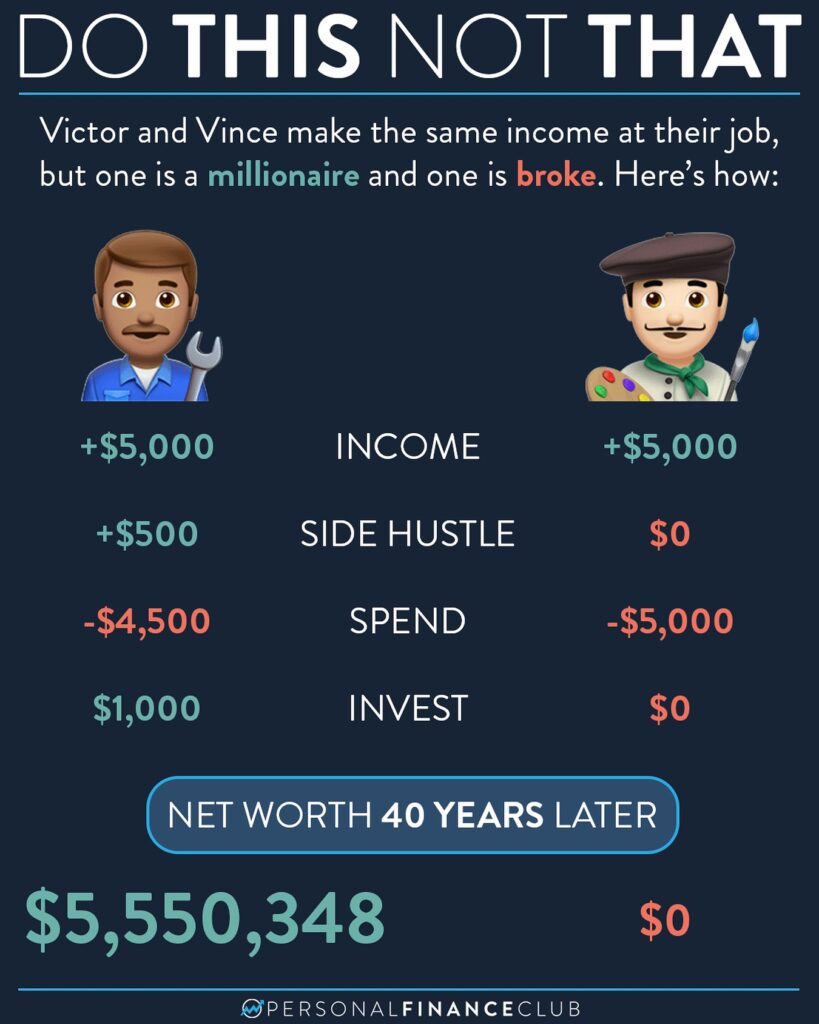 • “This is impossible”. I made this example because it represents VERY SLIGHT changes in lifestyle. Maybe Victor picks up ONE overtime shift per month, or does consulting for a few hours, or rents out a room in his house to make the $500 extra. And to reduce expenses by $500, it could be a couple extra nights cooking instead of door dashing, or a slightly more used car, or slightly cheaper rent. It takes some effort, but there’s money to be saved.