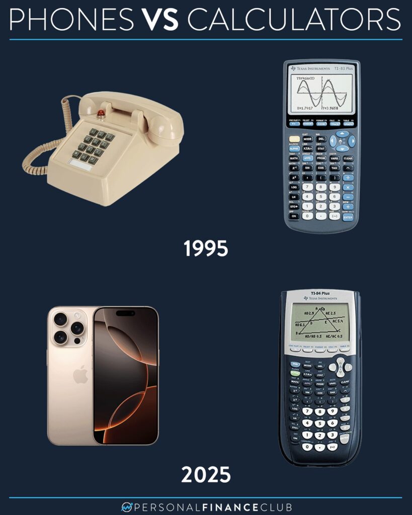 Why is it that over the last 30 years, phones have gotten infinitely more complex. Adding 5G internet, hi-res touchscreens, endless apps, advanced cameras, GPS, biometric security, AI, voice assistants, integrated payments, and more. And on the calculator side, we’ve gone from the TI-83 to the TI-84.
