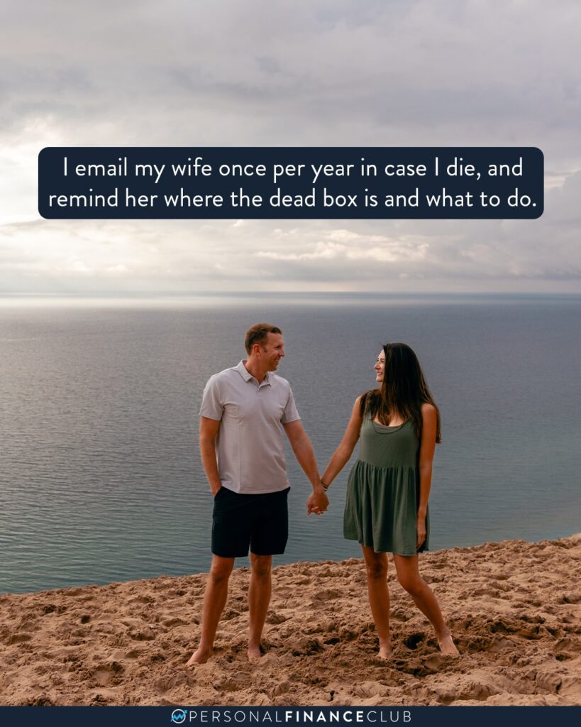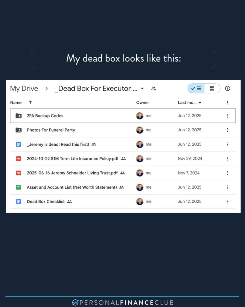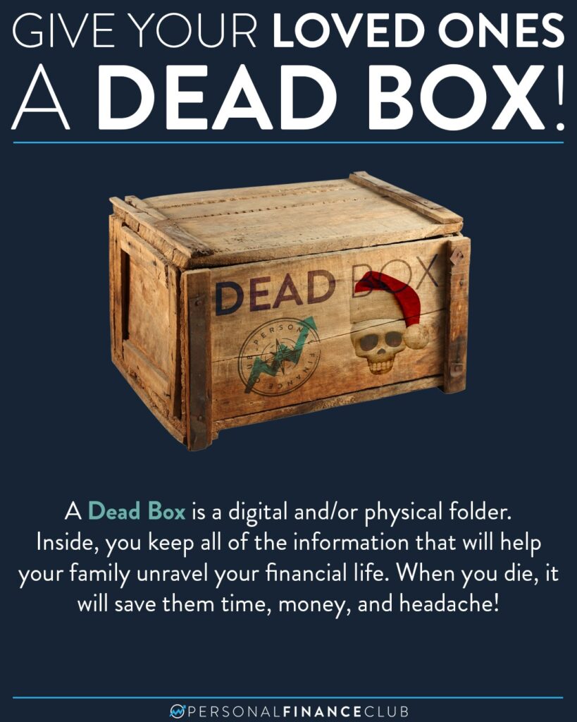 I really don’t want to die any time soon. But if I DO, I really don’t want to leave my family with a financial mess. And I certainly don’t want them losing millions of dollars they can’t find because I didn’t leave good enough records of where everything is and how to access it! So I give my family an act of love and kindness by keeping a dead box up to date. I also email my wife every year with a reminder of where it is, how to access it, and what to do in case I unexpectedly kick the bucket!