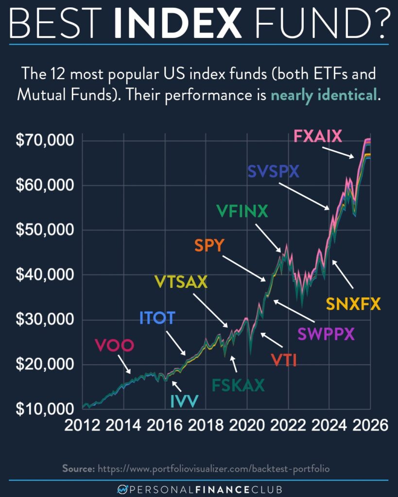 It turns out the S&P 500 index funds all outperformed the total market index funds by about 6% over this time. That doesn’t mean that trend will continue in the future (I actually expect it won’t), rather I think it reflects that large companies fared slightly better than small ones during the pandemic and AI tech boom.