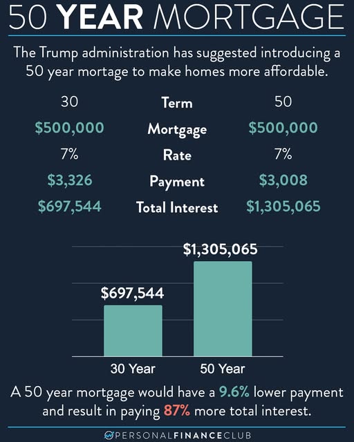 I’ve always been a fan of paying down your mortgage FAST (once you’re investing enough to be on pace for a healthy retirement). Extending a mortgage term from 30 to 50 years doesn’t excite me. It seems like very little upside, in exchange for a lot more systemic risk and a TON more total interest paid by borrowers.